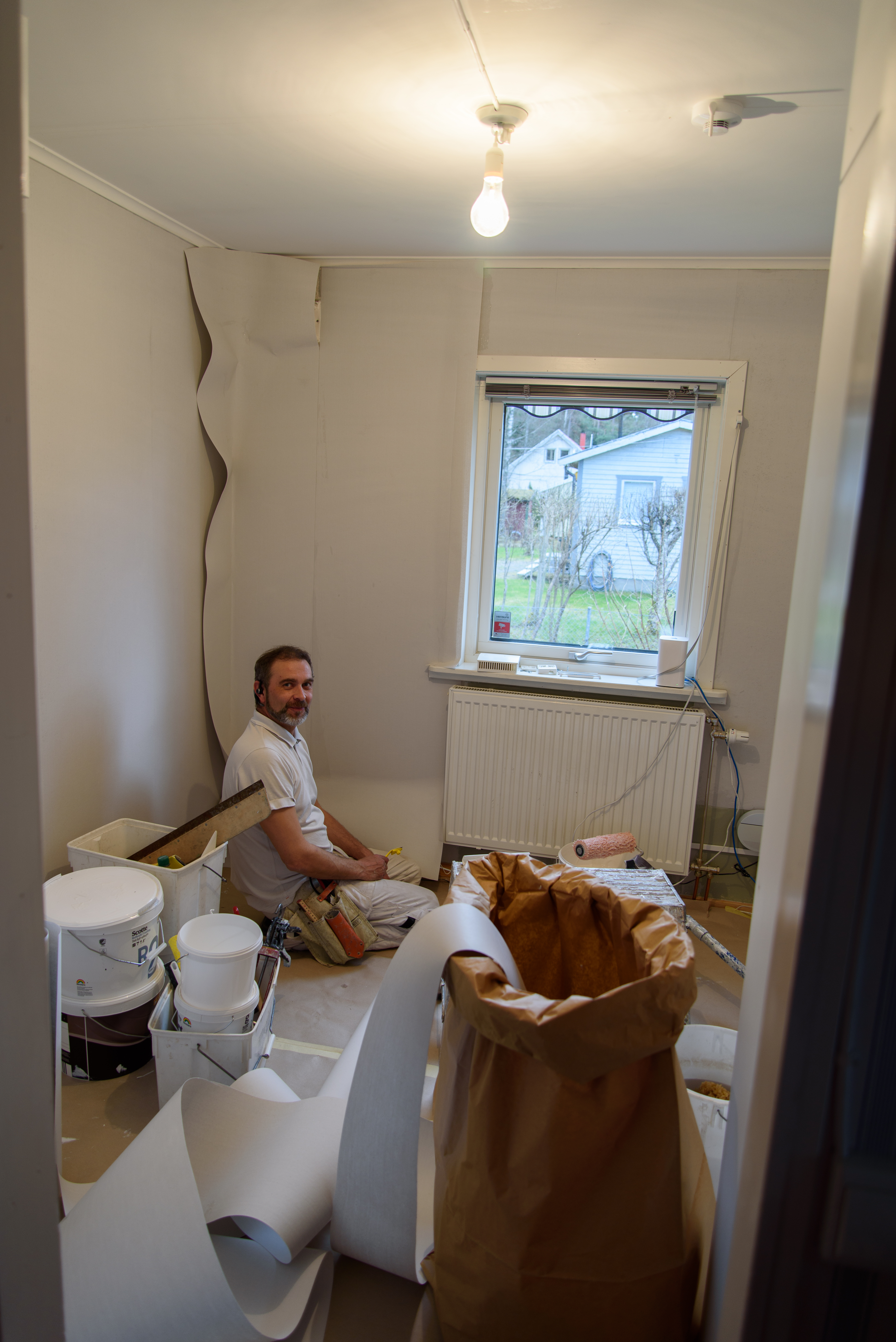 Det blev som jag misstänkte, vi var tvungna att sätta upp en särskild reparationstapet på väggarna innan vi får dit tapeter och färg. Bubblorna skulle aldrig ta slut annars. Vad reparationstapeten kostar vågar jag inte tänka på… Men det går framåt och vår duktiga målare Mika de Brun kämpar på.